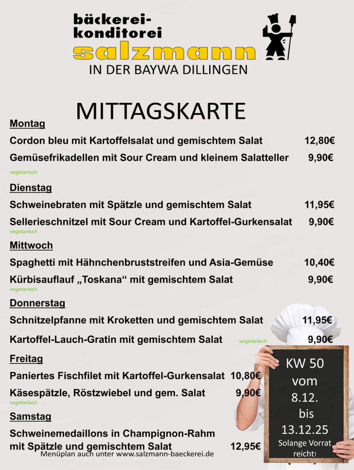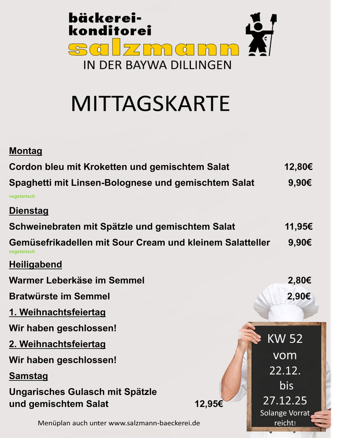 Neben unserer warmen Mittagskarte, gibt es zusätzlich noch eine große Auswahl an verschiedenen Salaten und Sandwiches, zweierlei Leberkäse im Semmel, Bratwürstchen ...